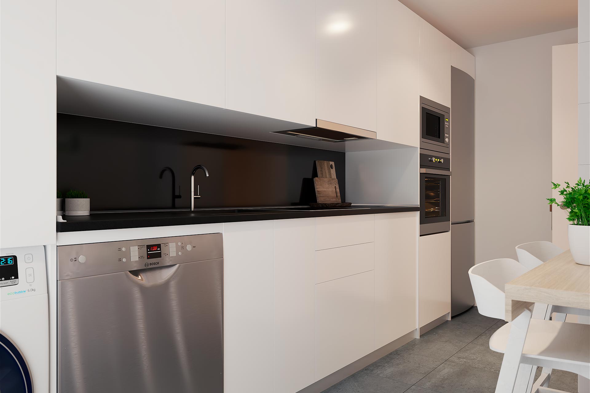 Un practico diseño de cocina con armarios altos y bajos de gran capacidad, encimera y frente de cuarzo.