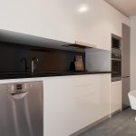 Un practico diseño de cocina con armarios altos y bajos de gran capacidad, encimera y frente de cuarzo.